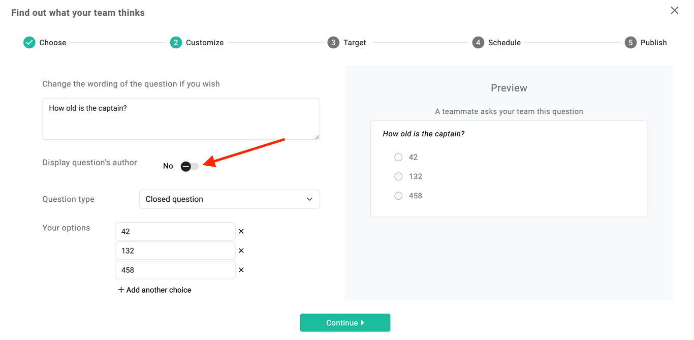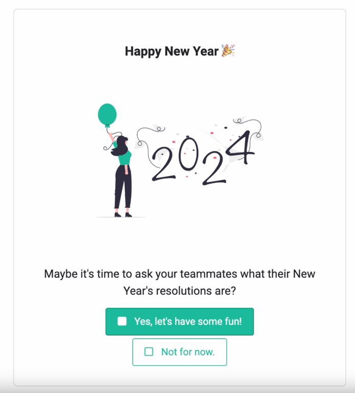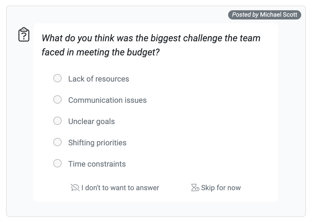 Ability to create a survey, with a limited life span, by admins but also Teammates. Sorted by categories