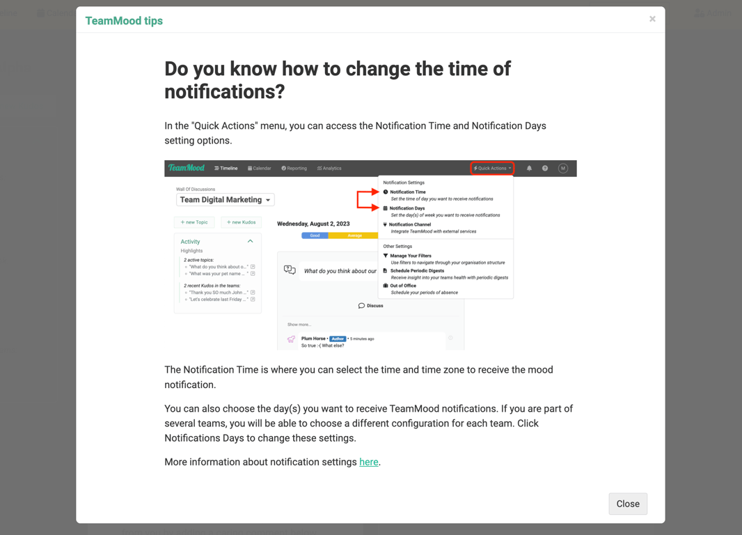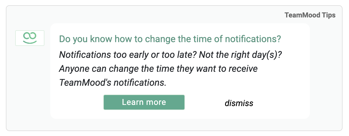 TeamMood's tip cards are available on your Timeline to illustrate all features and settings of the application.