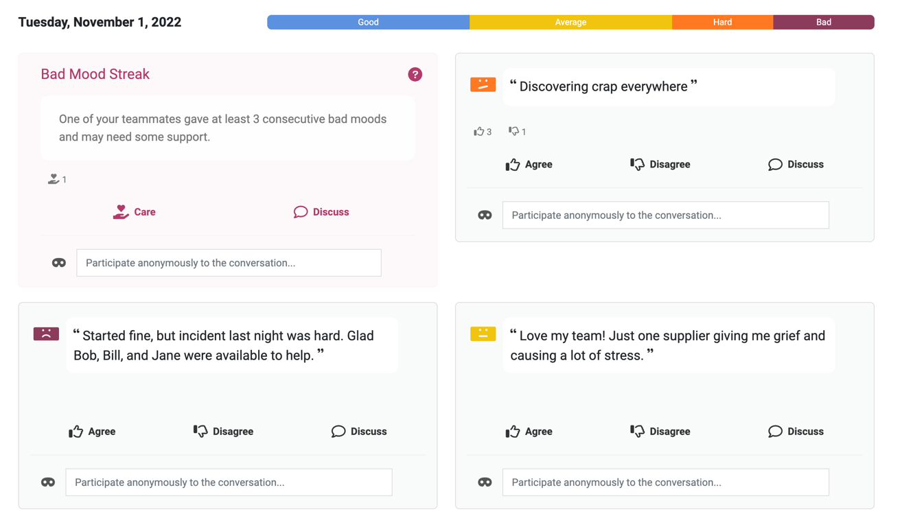 A new card appears in your Timeline when someone is going through a tough time. TeamMood detects a bad mood streak when a person shares 3 consecutive bad moods. This alert invites you to show your support for the person and start a specific discussion.