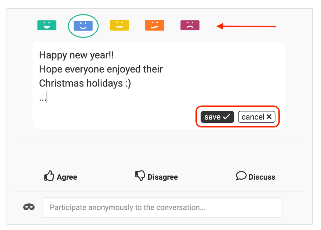 When you click on the edit (pencil) icon, you activate the edit mode which allows you to change your mood and update the content of your comment.