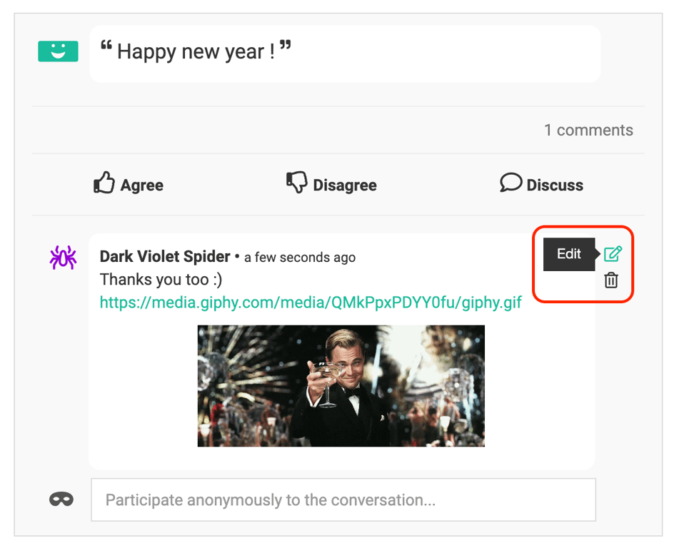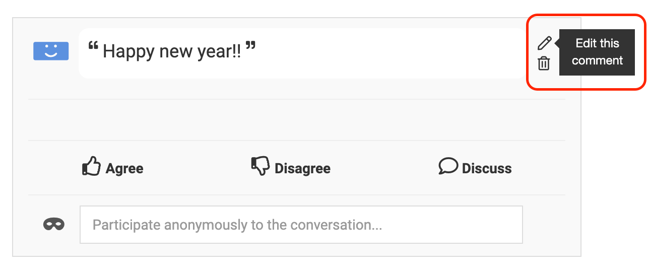 Edit or delete the comment you posted directly by clicking on the corresponding icon. Icons appear at the top right of the mood card when you hover over your message.Â