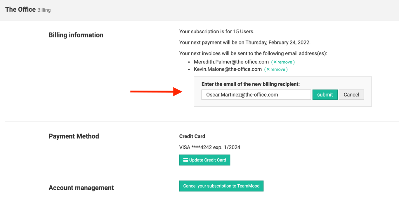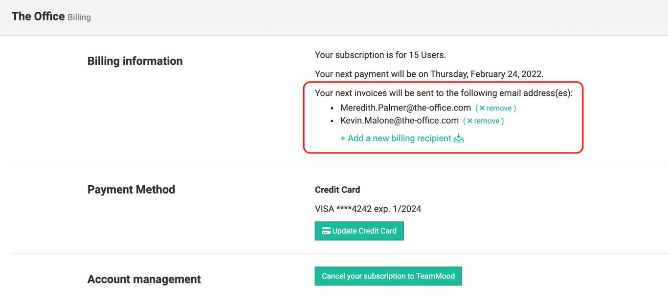 In the "Billing information" section, the email addresses of the invoice recipients are listed and you can add or remove them as you wish.