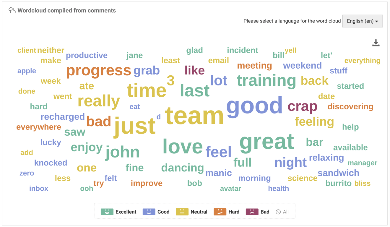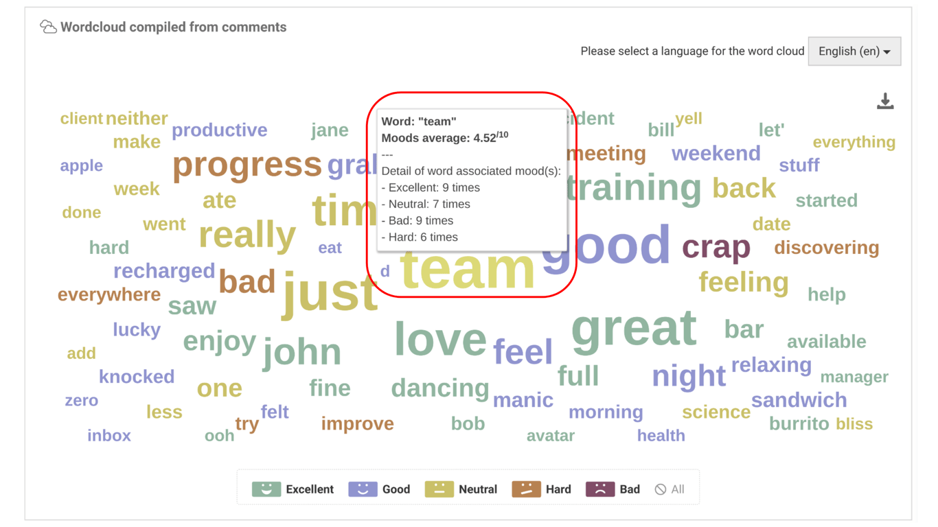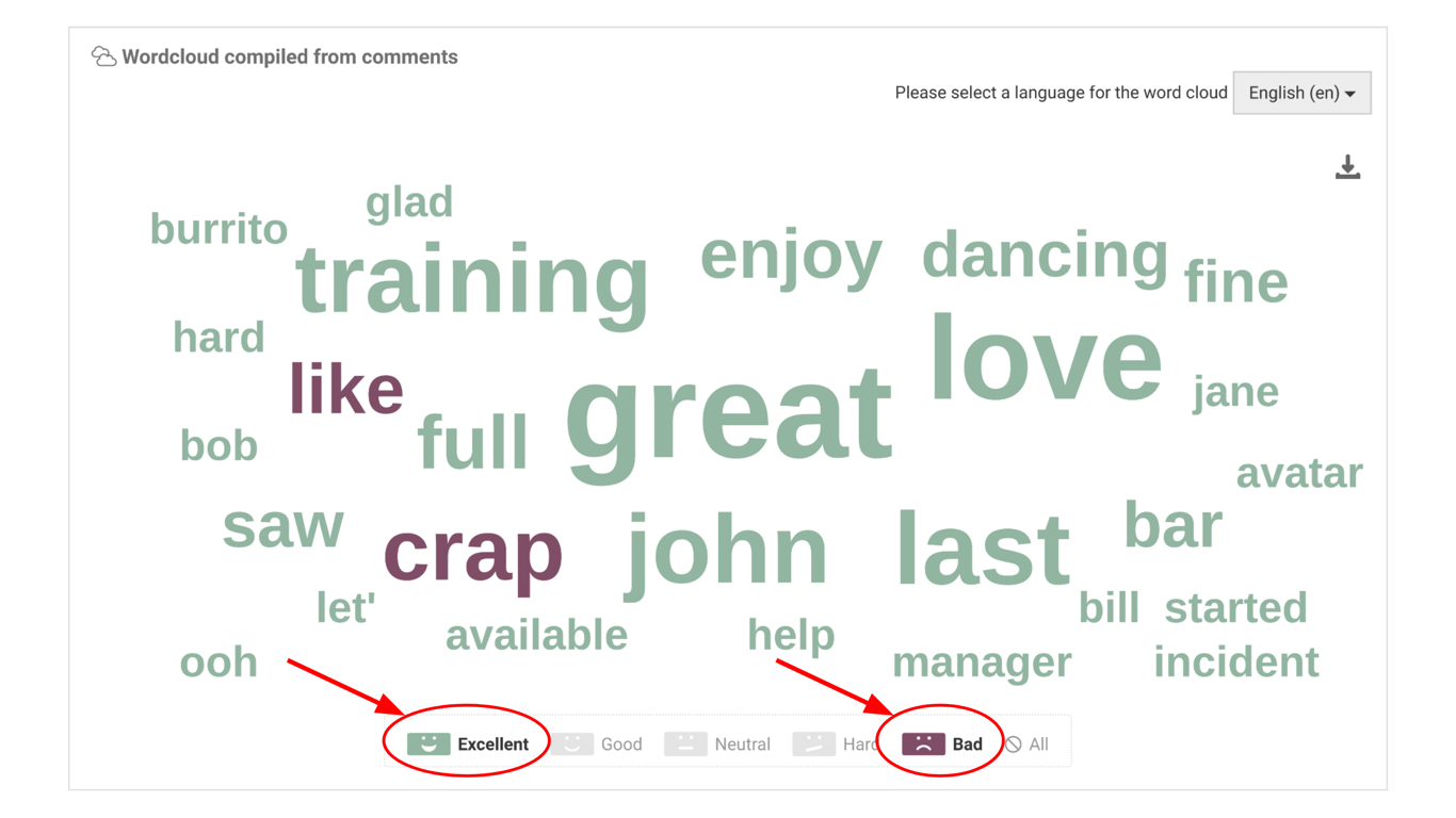 In the Wordcloud compiled from comments (Analytics), the word colors now reflect the mood of the comments they are extracted from.