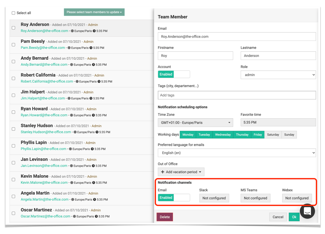 As a TeamMood admin, you can now enable or disable configured notification channels (email, Slack, Microsoft Teams or Webex) for each one of your teammates.